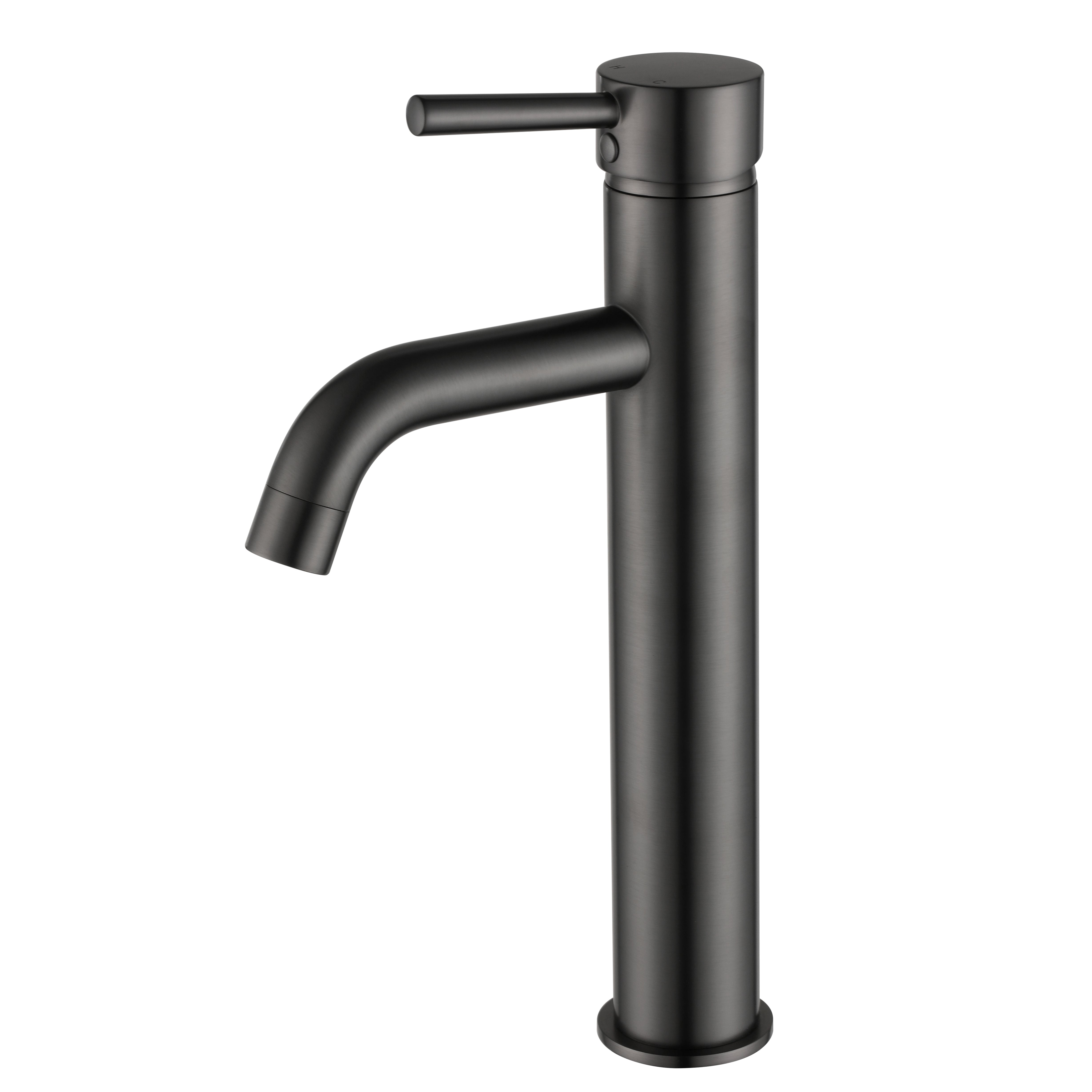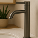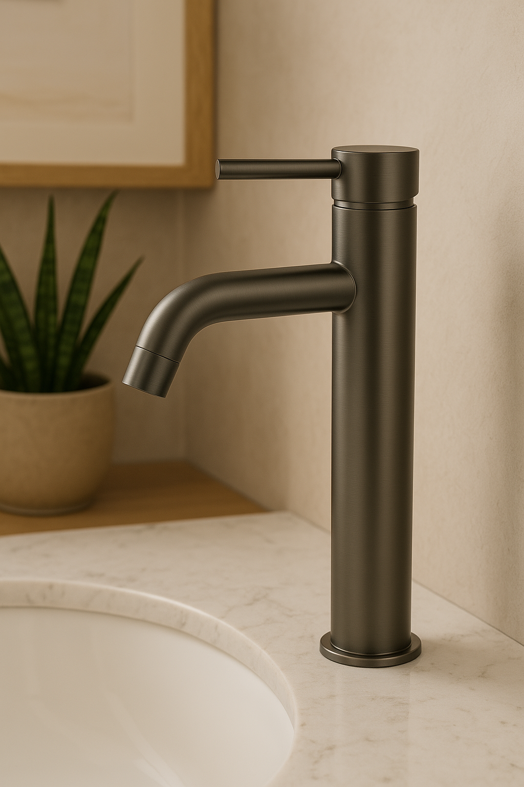 The Gunmetal Tall Basin Mixer (Model: UNA-70Q) offers a sleek, modern design with efficient water flow and an easy-to-use 35mm cartridge, perfect for any contemporary bathroom.